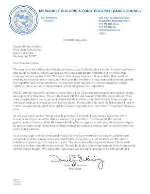 During the 10 years between the 2006 debate and this latest round of legislation, the world changed greatly. A broad scientific consensus emerged that there is no credible strategy for reducing carbon emissions from the electricity sector that doesn’t include more nuclear generation. Commercial nuclear energy was a key component of the U.S. carbon reduction commitments at the recent international climate talks in Paris. Wisconsin media editorialized in favor of lifting the ban and praised the Senate’s vote.